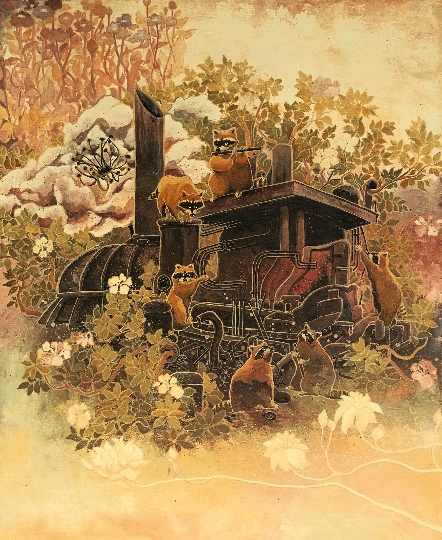 Des restes d’un générateur nucléaire rouillent en dodelinant des écrous. Le vent siffle entre les tuyaux qu’il dévisse lentement. Ce phénomène donne aux ratons-laveurs qui ont investi ce tableau post-humain une petite idée musicale.